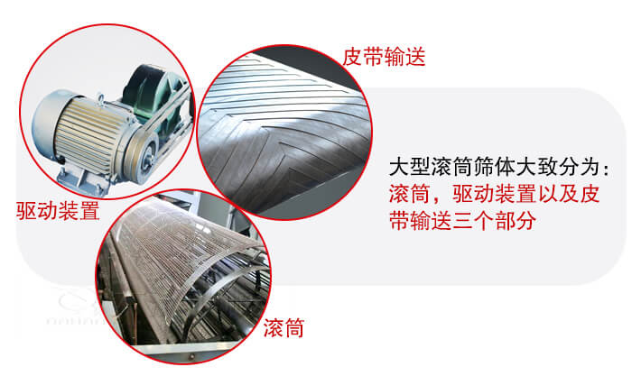 大型滾筒篩體大致分為:滾筒,驅(qū)動(dòng)裝置以及皮帶輸送三個(gè)部分,產(chǎn)品的結(jié)構(gòu)比較簡(jiǎn)單,維修方便。