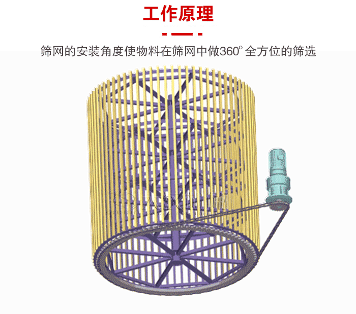 物料從料斗進(jìn)入滾篩中,經(jīng)過篩網(wǎng)網(wǎng)孔大小的篩選以及電機(jī)帶動(dòng)軸承于篩網(wǎng)的滾筒,能夠保證物料在篩網(wǎng)中做360°全方位的篩選,同時(shí)經(jīng)過篩網(wǎng)選出的物料就會(huì),經(jīng)皮帶輸送機(jī),輸送到固定的沙堆或者直接裝車運(yùn)走,沒有篩出的物料就會(huì)隨篩筒滾動(dòng)到篩尾,從廢料口流出。