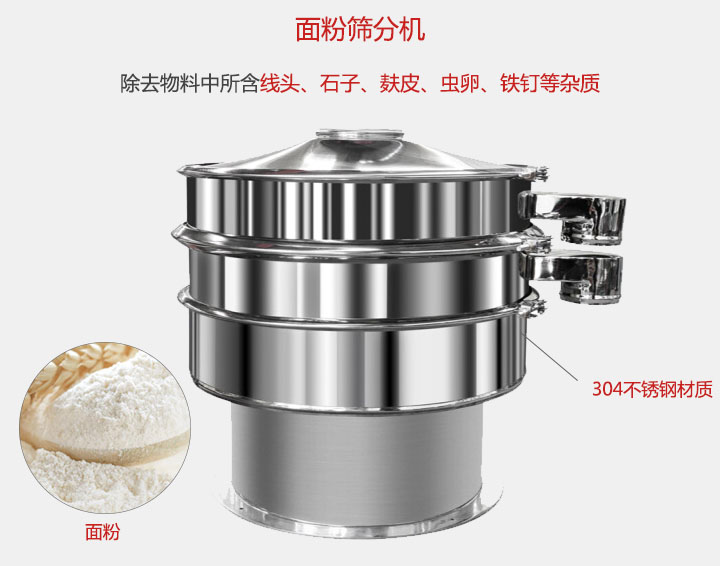 面粉篩分機廣泛用于:顆粒染料,面粉,石粉,樹脂粉,桃汁,金屬粉末 ,鎢粉,玉米,碎石粉,石英砂。